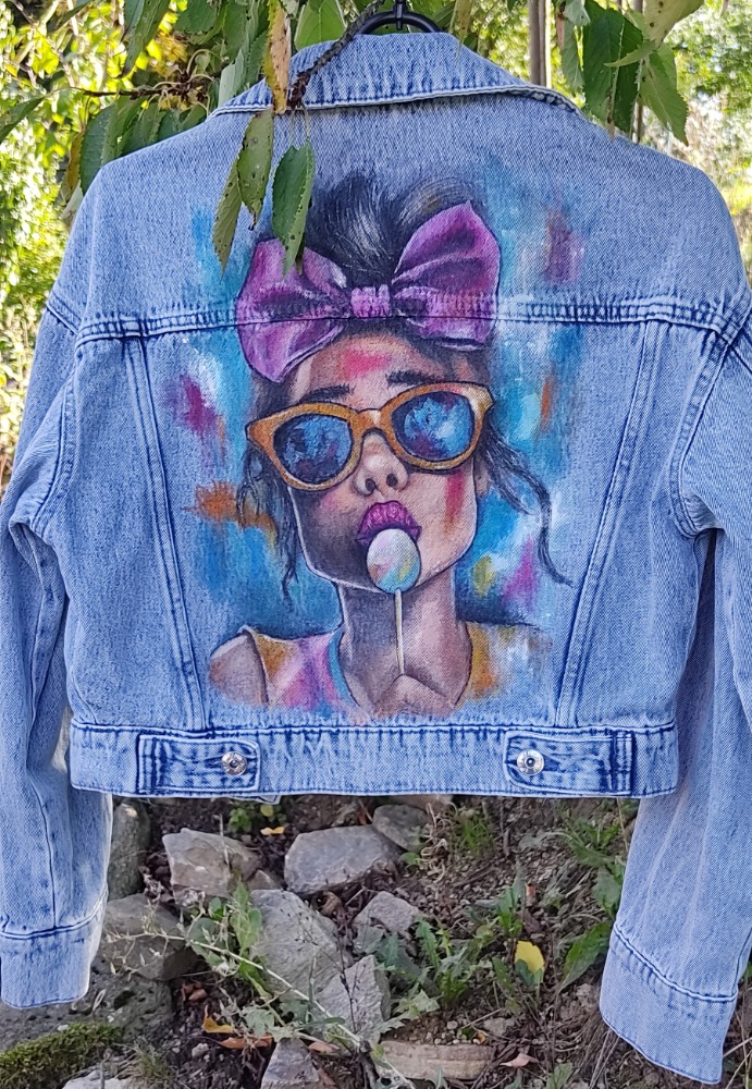 Každá bunda je 100% originál, protože motiv je malován ručně, nikoliv tištěn. Žádná sériová výroba, jen poctivá ruční práce a kreativita. Na zadní straně bundy dominuje výrazná ilustrace dívky s brýlemi, růžovou mašlí a lízátkem. Barevná kombinace působí hravě, energicky a dodává klasické džínové bundě zcela nový rozměr.